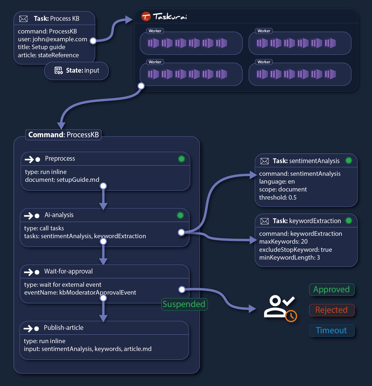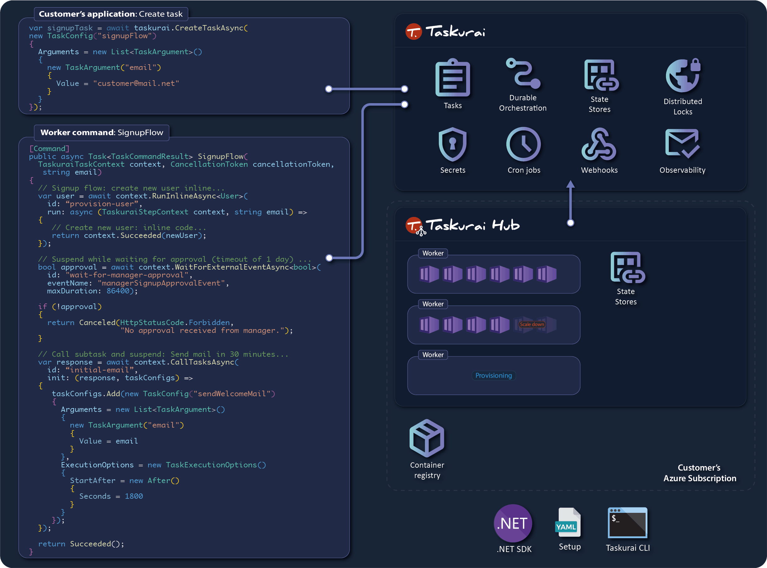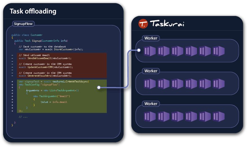 With Taskurai, you can easily offload tasks without the need of a complete refactor of your application. You can introduce asynchronous patterns and microservices incrementally, making your application more scalable, robust and responsive.