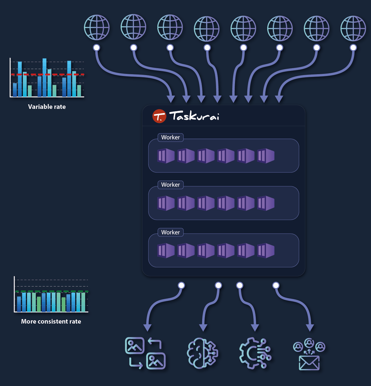 Taskurai offers significant scalability on demand during peak periods, requiring substantial processing power while eliminating the need for expensive servers during low-demand periods.