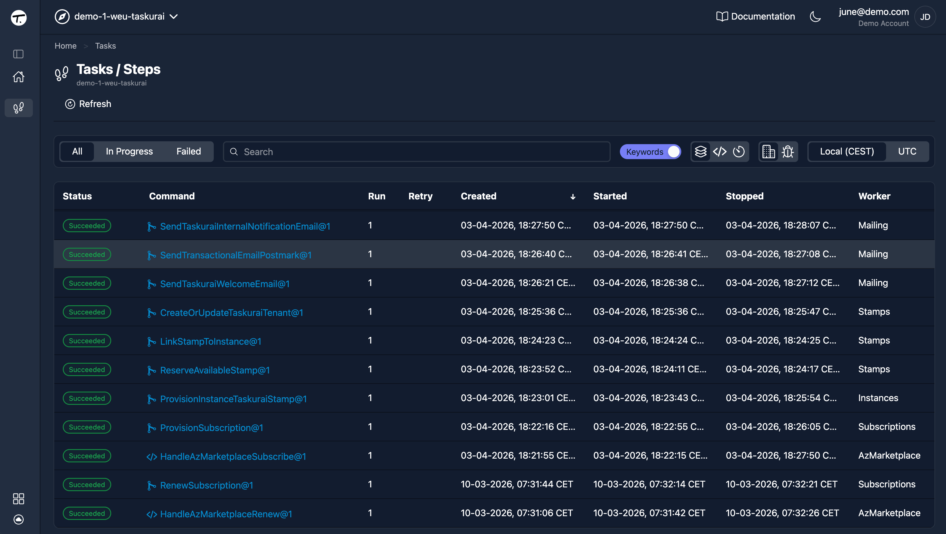 Monitor and debug every task, step, and workflow. Drill into subtasks, identify failures instantly, and explore logs tied to every execution.