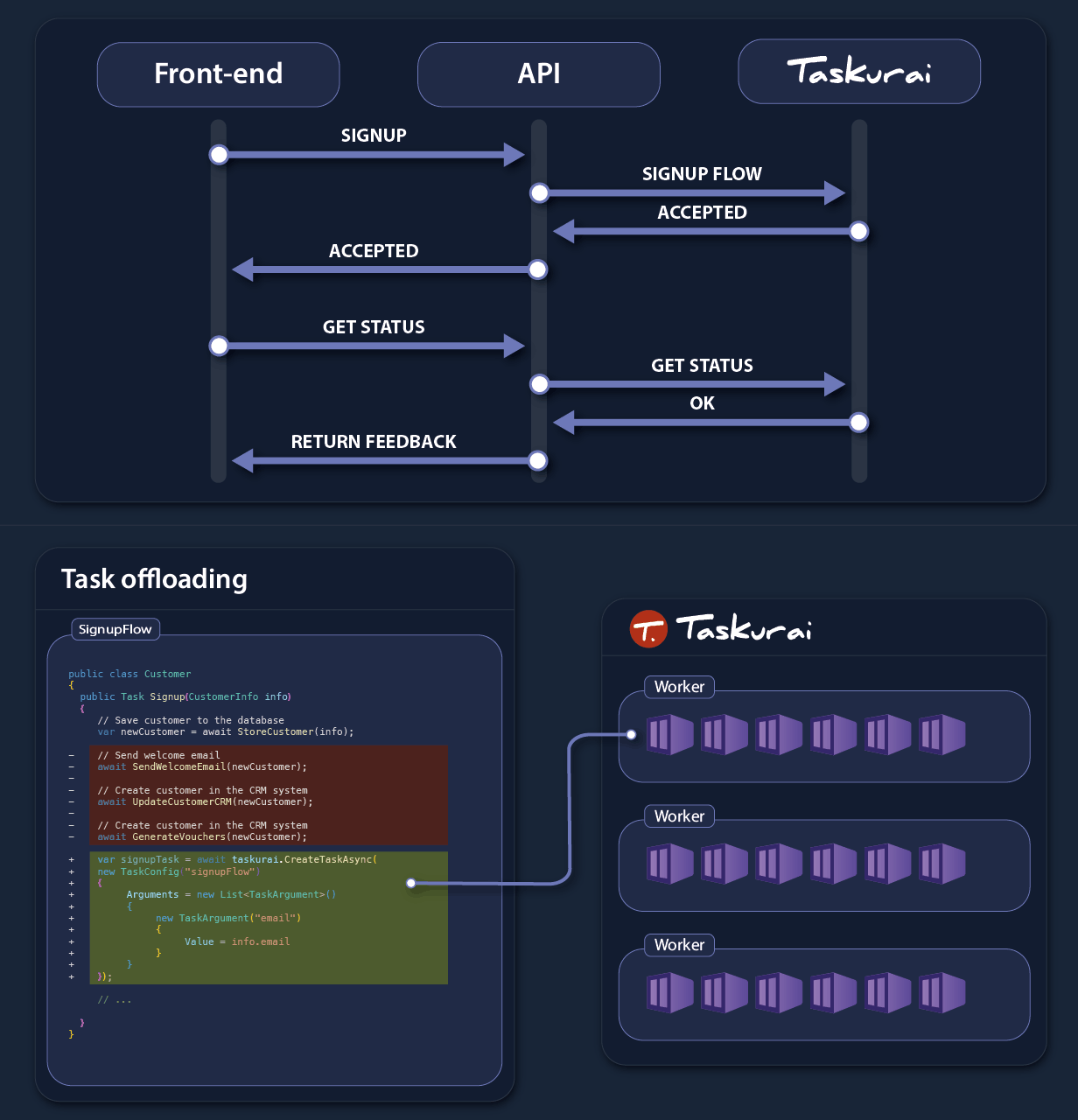 With Taskurai, you can easily offload tasks without the need of a complete refactor of your application. You can introduce asynchronous patterns and microservices incrementally, making your application more scalable, robust and responsive.