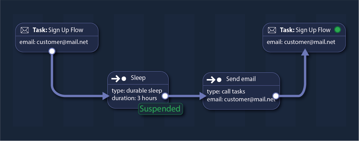 Delay task execution reliably with durable sleep, allowing commands to suspend for seconds, minutes, or even days without consuming resources. When the sleep duration ends, execution resumes seamlessly from where it left off.
