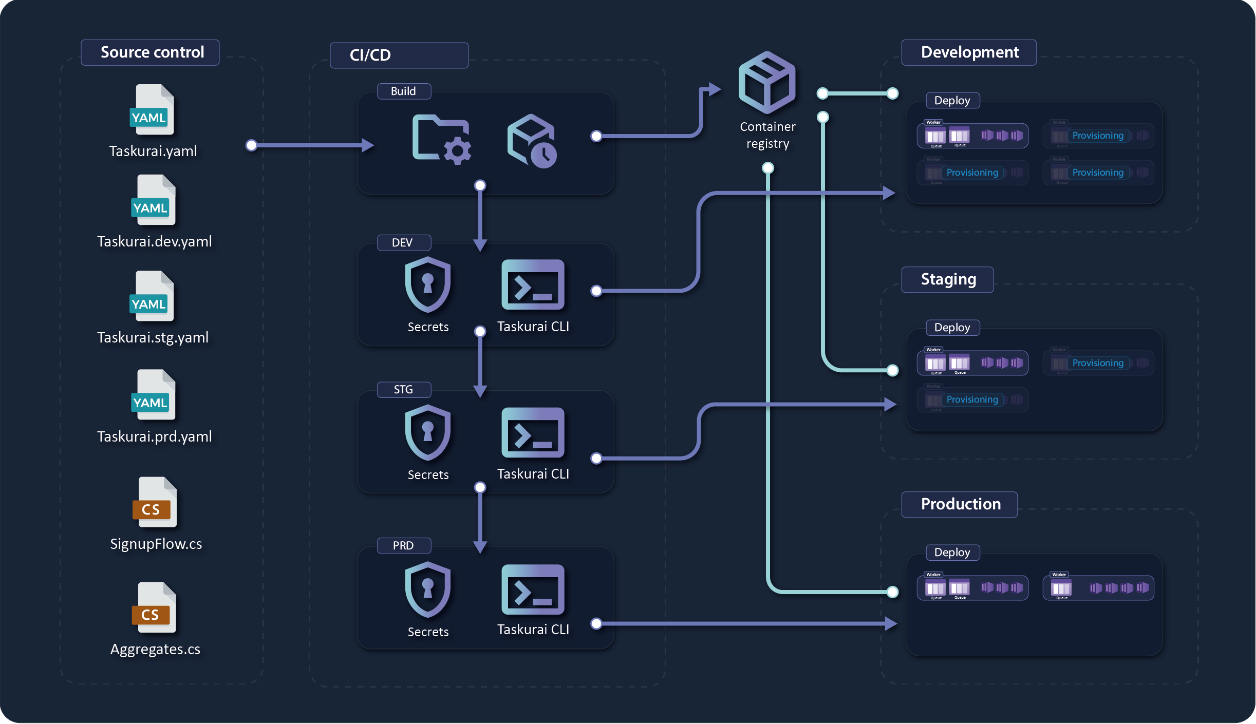 Define multiple Taskurai environments for development, staging, production with ease with scoped configuration files and secret overrides for each environment.