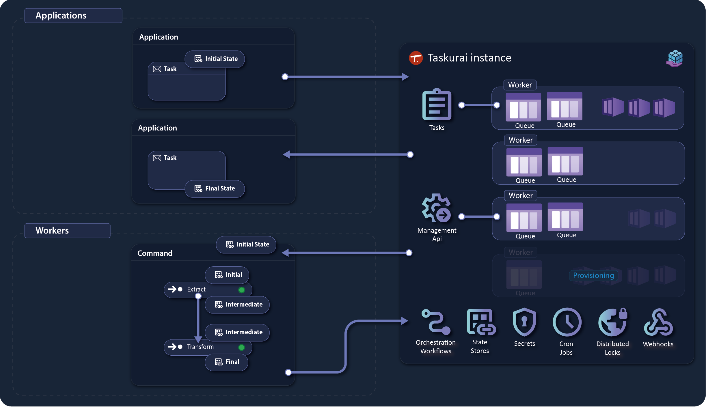 Build long-running stateful applications using key-value state stores (storing serializable data or any binary content). Store any generic state or link state to task initialization, intermediate and final state.