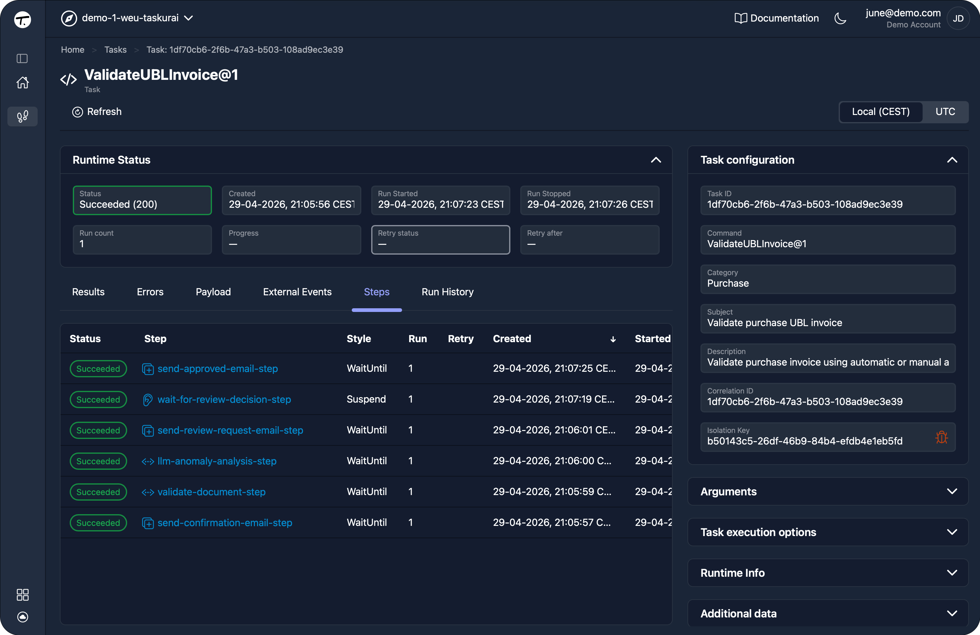 );CreateTaskAsync is durable. The step initializes once, regardless of what happens to the worker afterward. The email sub-command handles its own retries and observability — completely independent from the main flow.